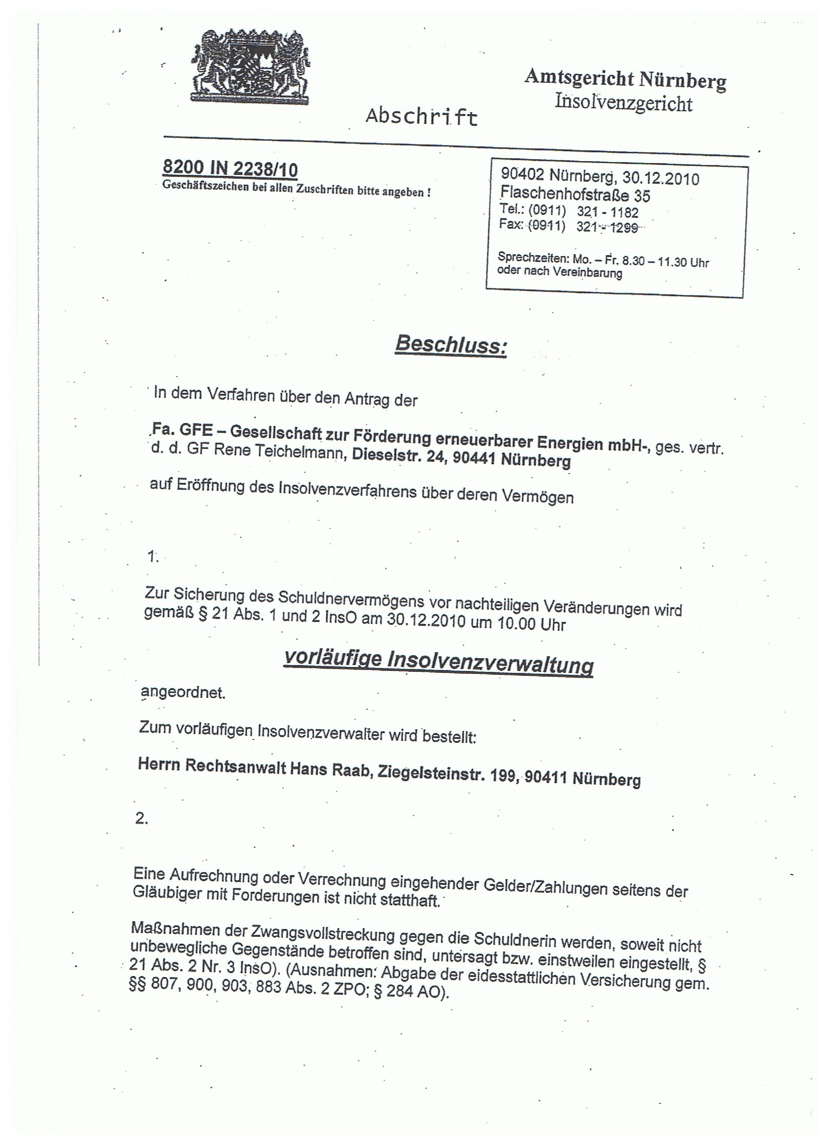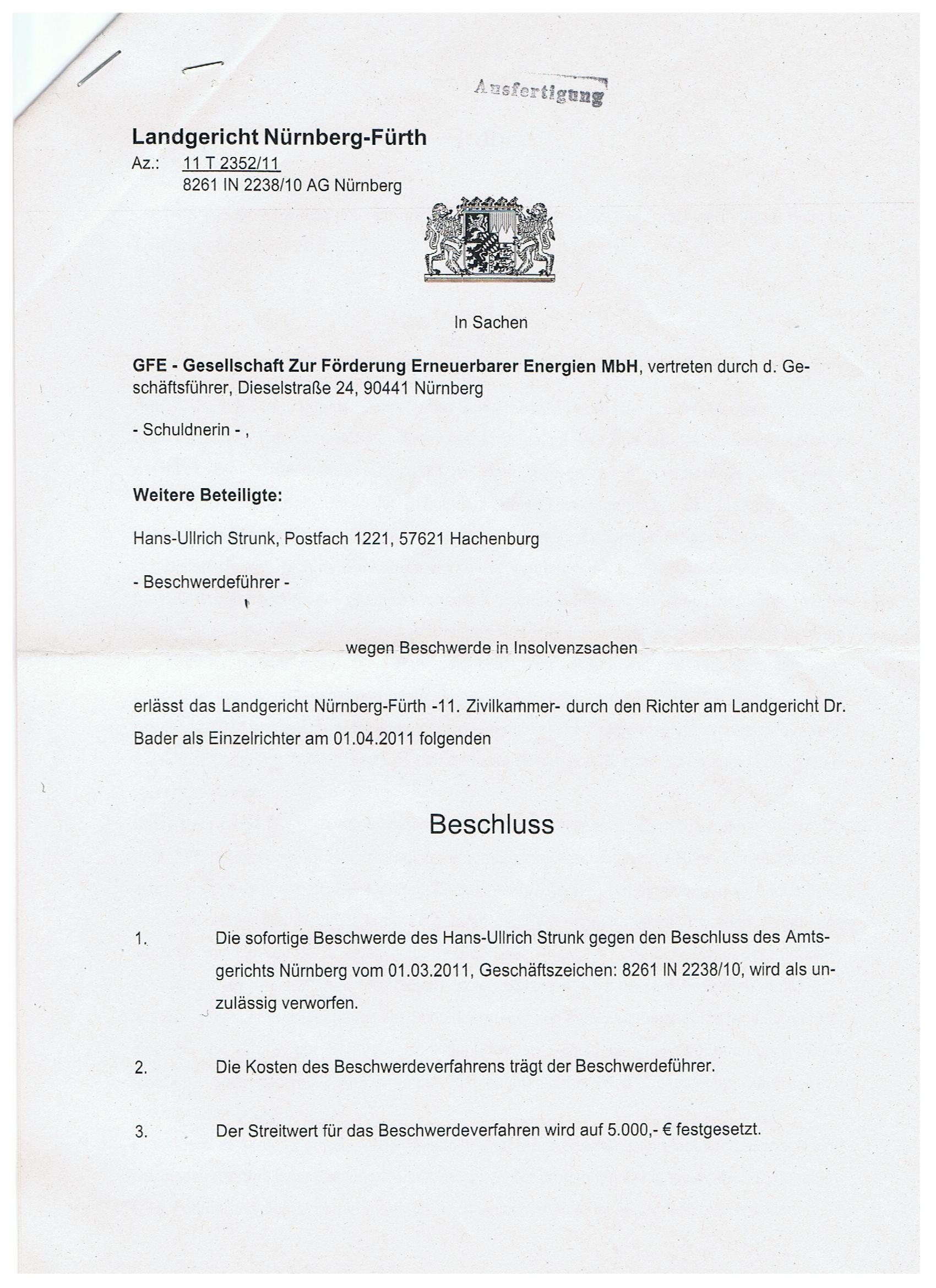 Die GFE mbH hatte beim Landgericht Nürnberg Beschwerde eingelegt hinsichtlich des Beschlusses des AG Nürnberg das vorläufige Insolvenzverfahren einzuleiten.