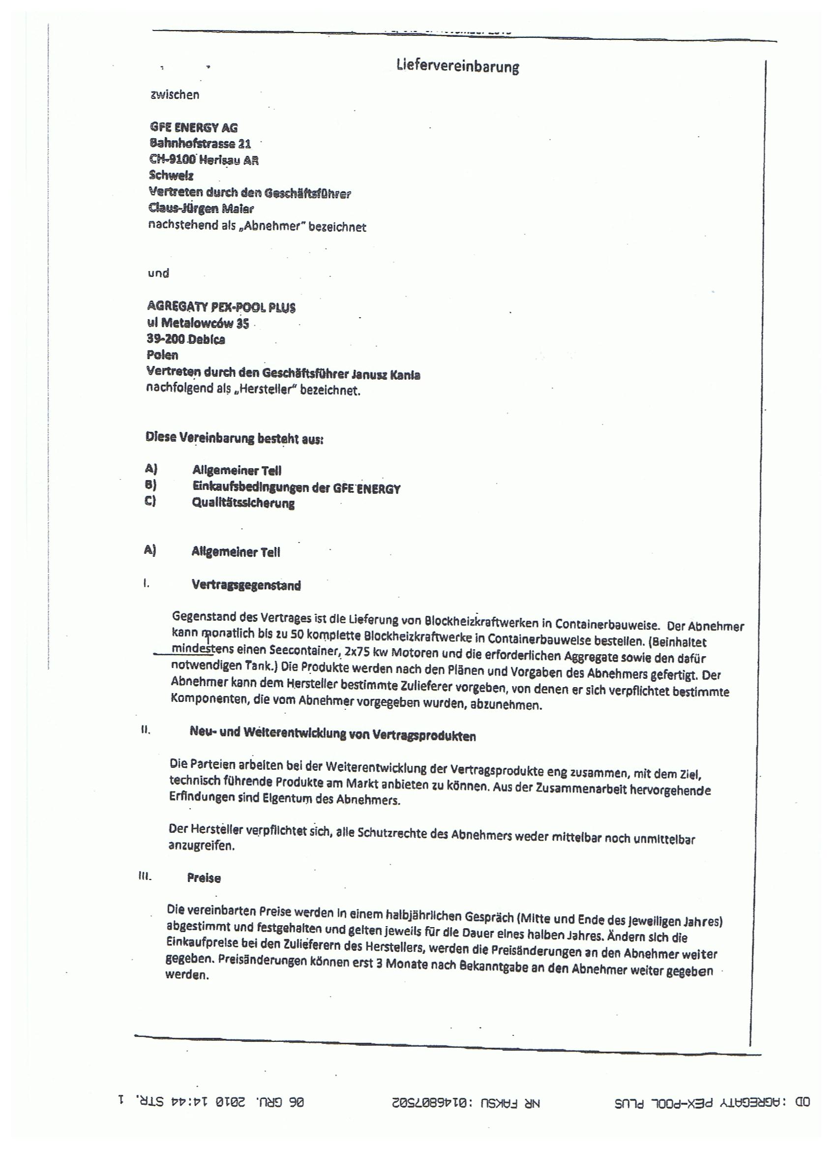 darauf, dass am 15.11.2010 mit uns ein weiterer Kooperationsvertrag geschlossen wurde mit Wirkung bis zum März 2011. Wir erkennen hieraus, dass das Geschäftsmodell der GFE langfristig angelegt ist !
