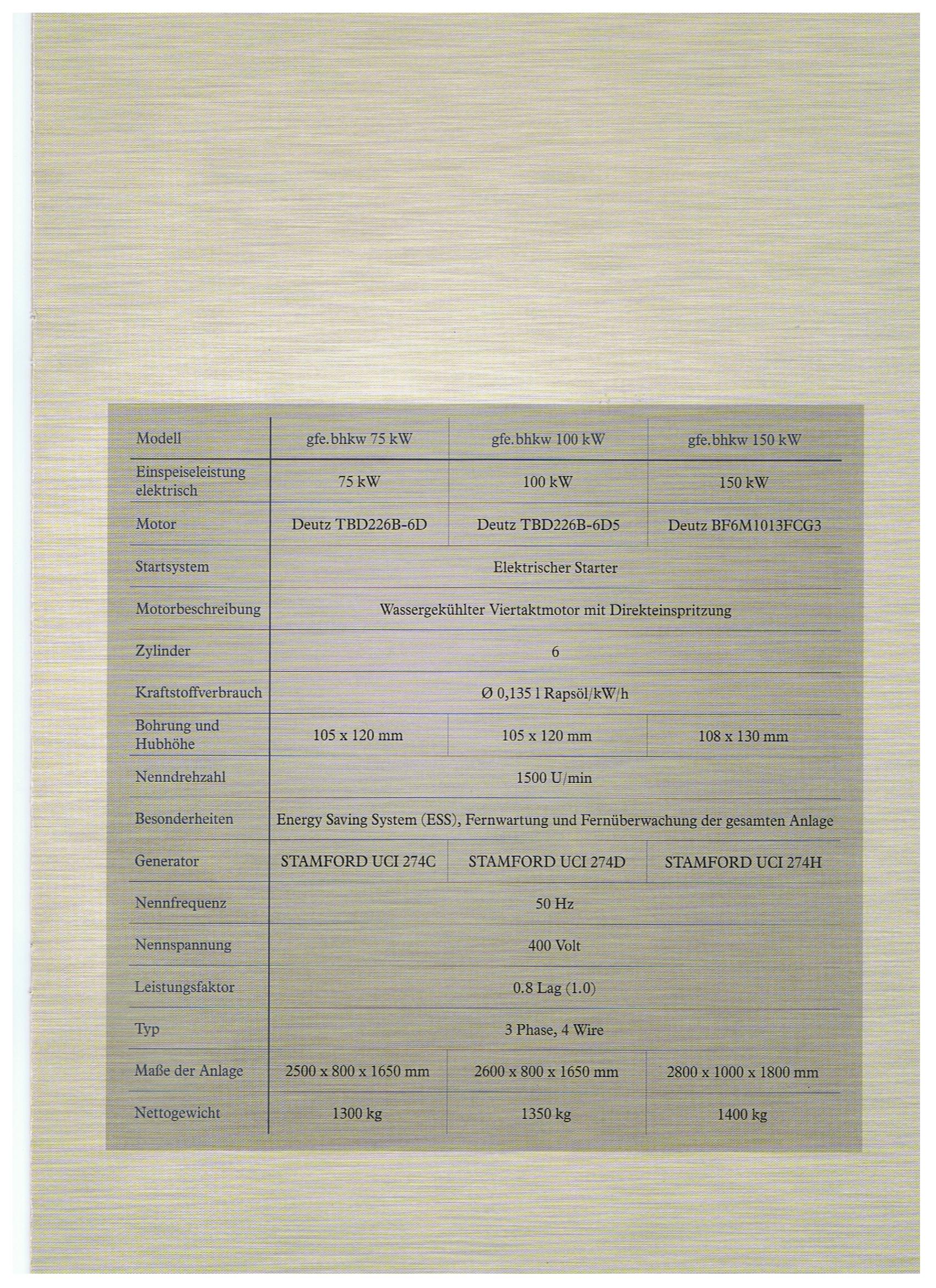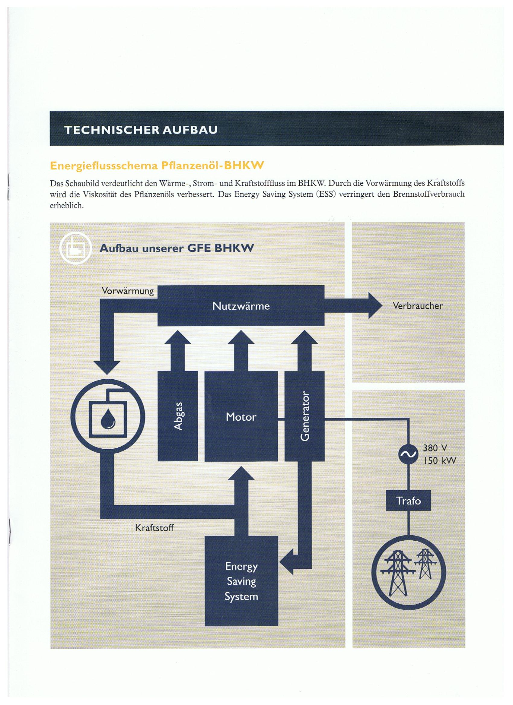 Die Gutachten von DEKRA Stuttgart ( 24.09.2010 ) und TÜV SÜD CZECH (29.09.2010 ) weisen aus, dass ein Verbrauch an Rapsöl vorlag von ca. 12 l / 100 kWh an elektrischer Energie, die am Generator ausgegeben wird.