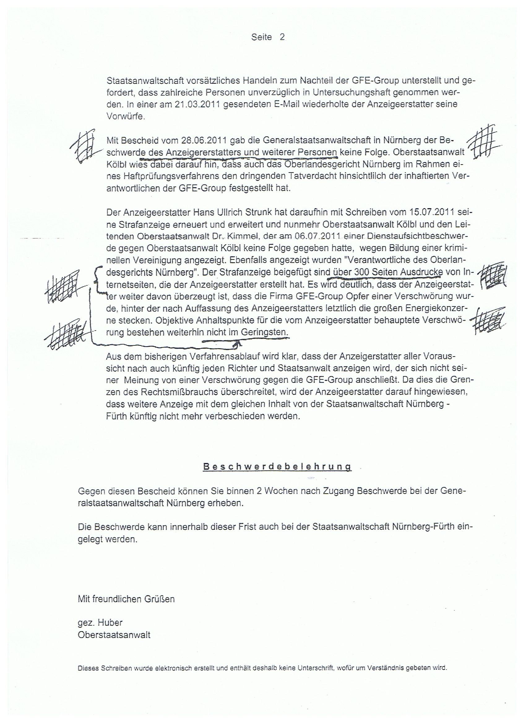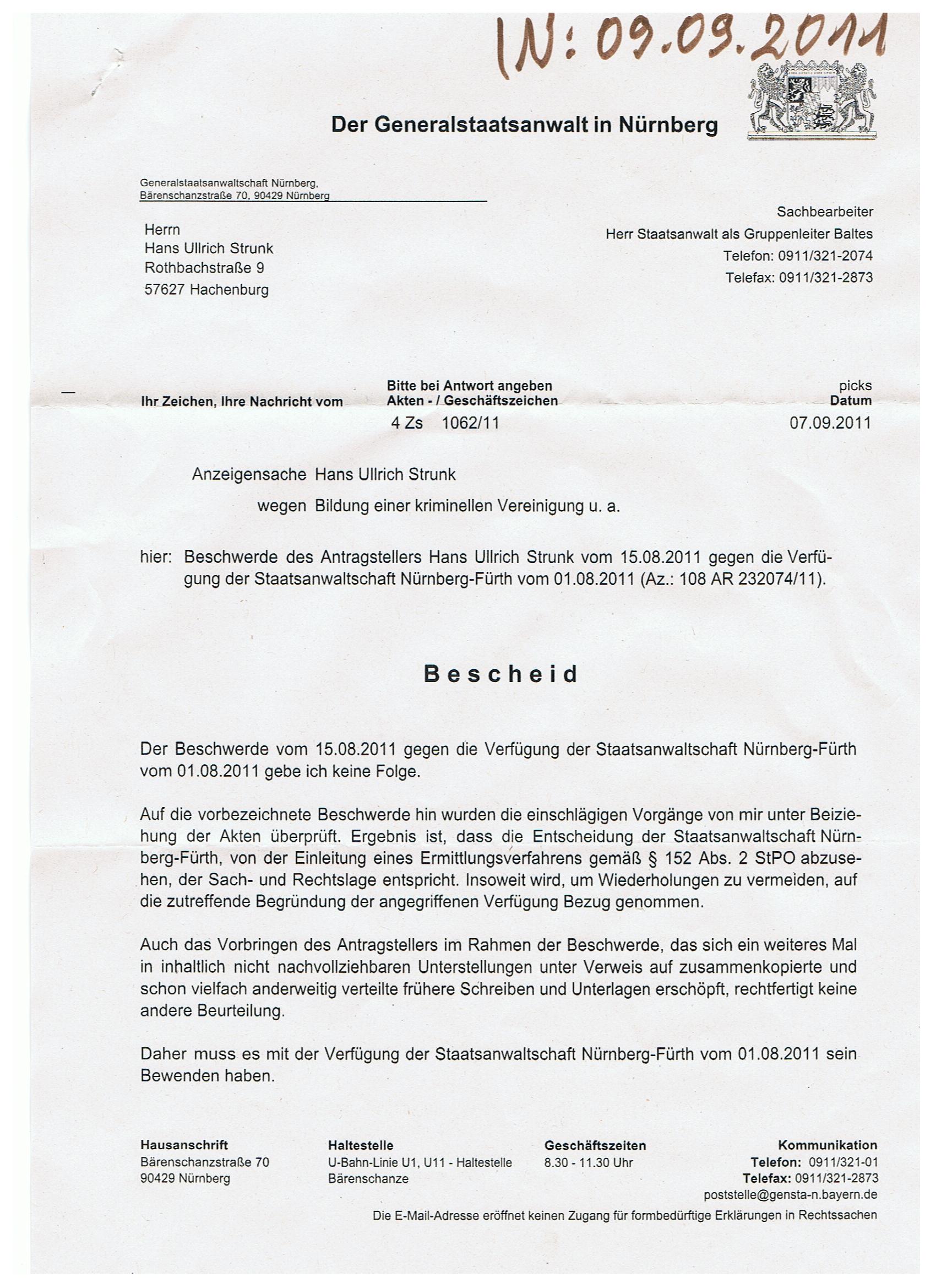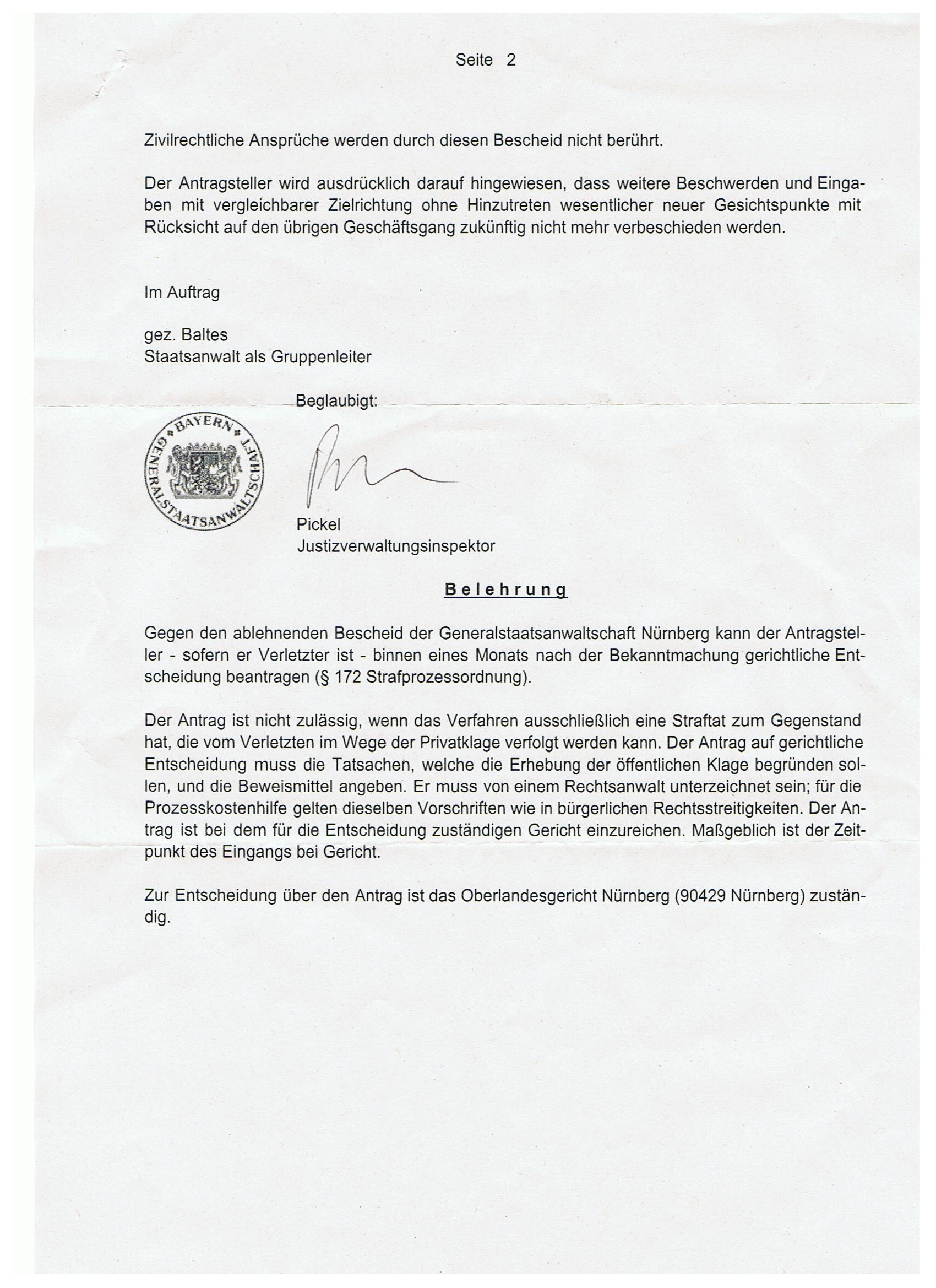 Nachdem ich wiederum Beschwerde eingelegt hatte bei der Generalstaatsanwaltschaft in Nürnberg, erhielt ich von dort den folgenden Bescheid :
